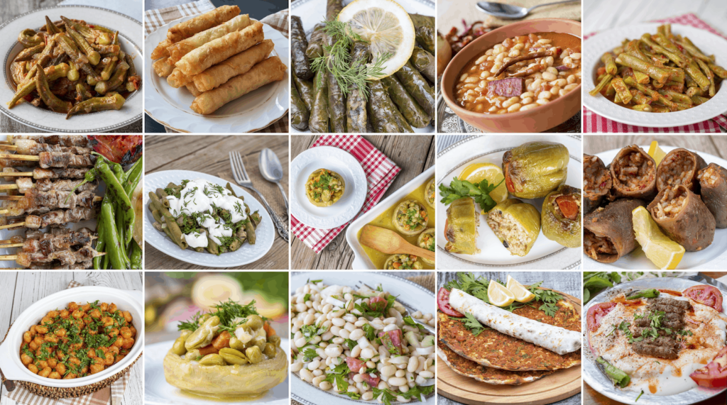 Adana or Urfa Kebap, döner, dürüm, şiş, iskender kebap, lahmacun, pide, mantı (dumplings), çiğköfte (spicy bulgur rolls), içli köfte (stuffed meatballs)… Dolma (stuffed pepper), sarma (stuffed grape leaves), çorba (soup), köfte (meatball), kokoreç (lamb intestine sandwich)…