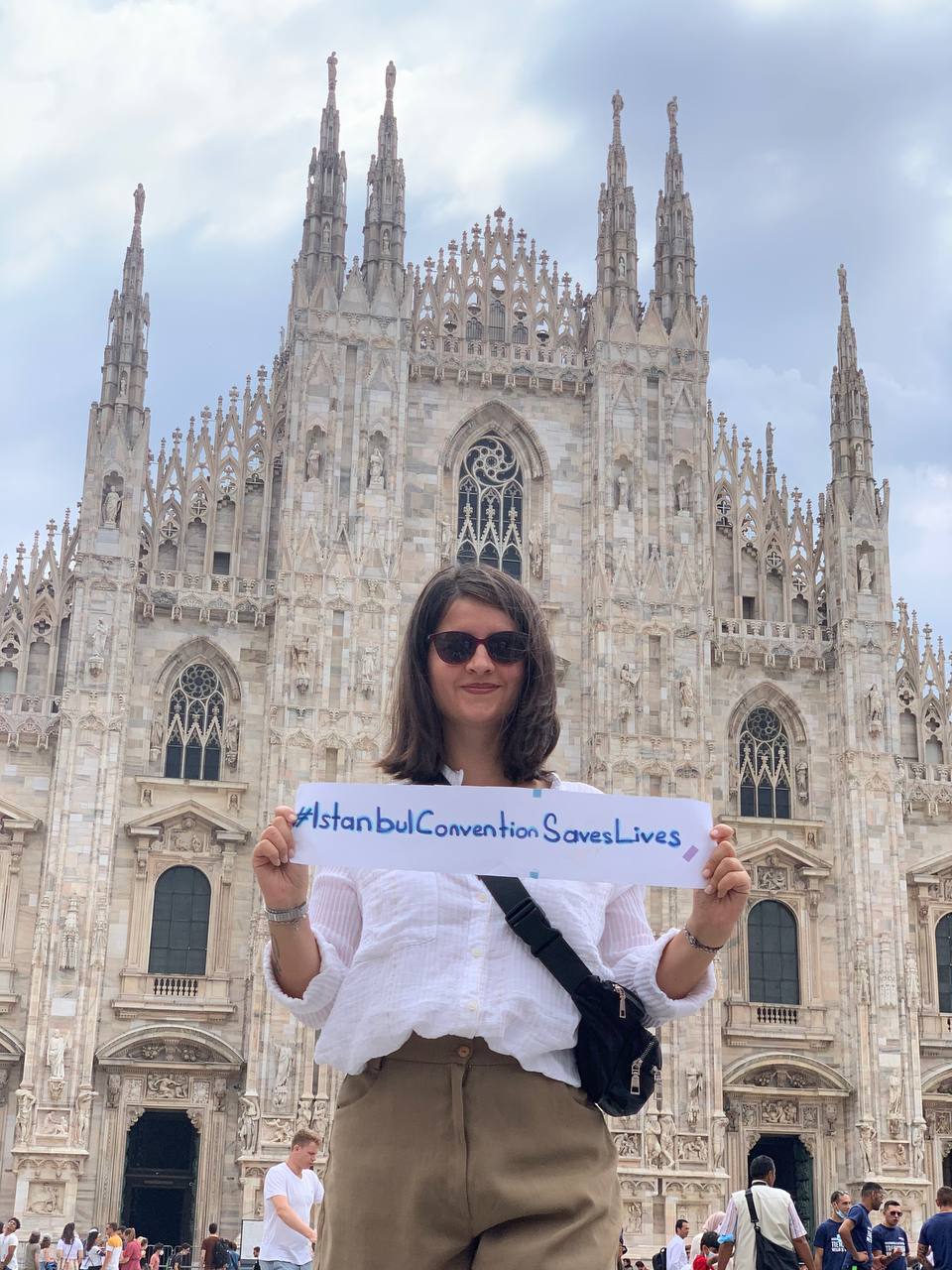 Finally, here I am in all around Europe with a message. I am in Milan, Cologne, Valencia, Vienna, Budapest, Banská Štiavnica, Prague, Krakow… Barcelona, Leipzig, Copenhagen, Las Palmas de Gran Canaria, Brussels, Berlin, Paris, and Istanbul. The message I’m spreading is in 12 countries, 15 cities, and in 10 different languages is; Istanbul Convention Saves Lives. Istanbul Convention is ours and we won’t give up on it. Again, if the governments implement the treaty, Istanbul Convention Saves Lives.
